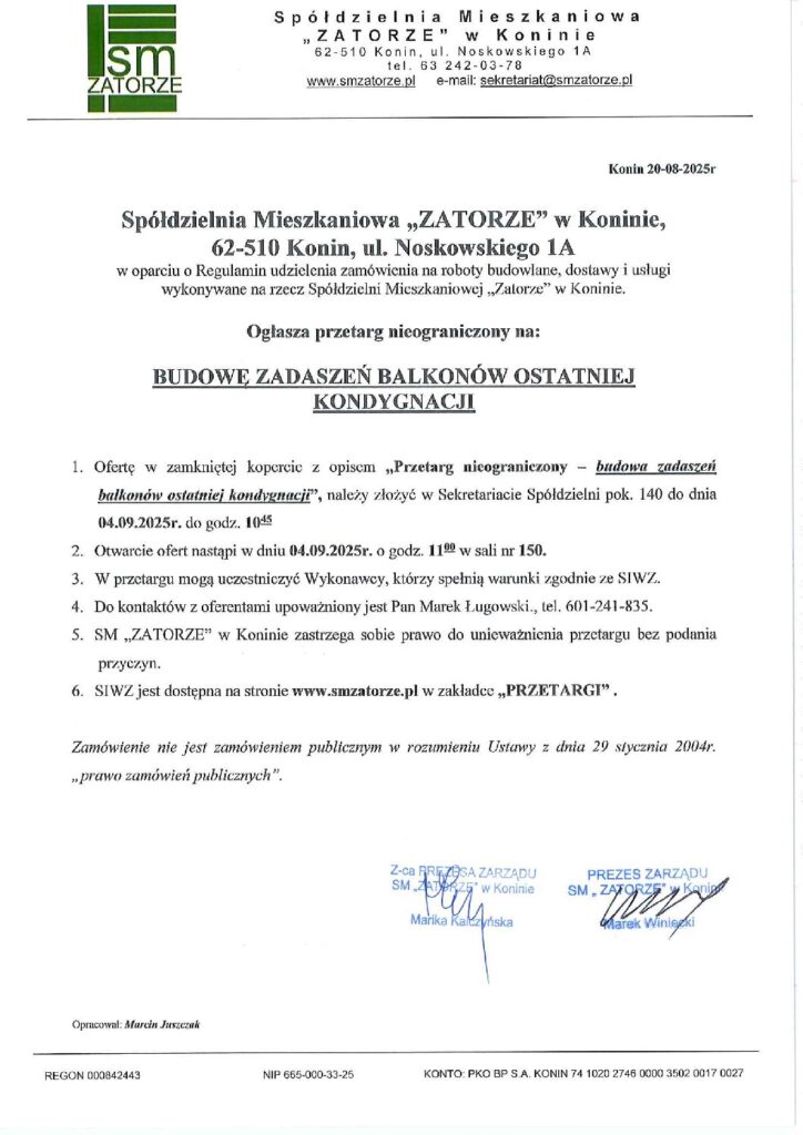 OGŁOSZENIE PRZETARGU – BUDOWA ZADASZEŃ BALKONÓW OSTATNIEJ KONDYGNACJI