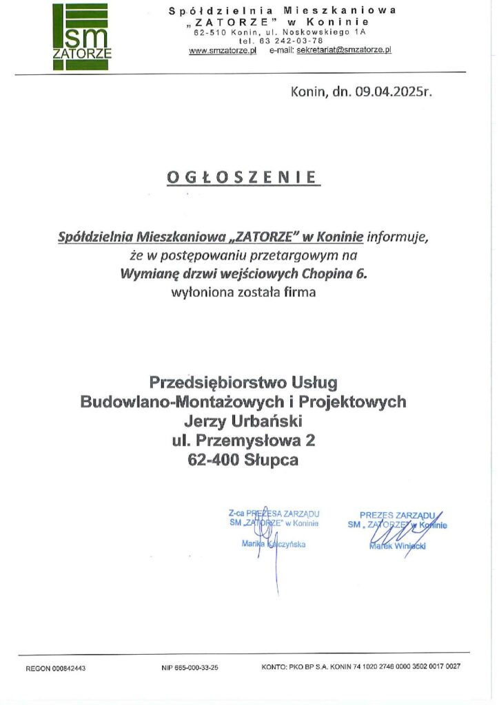 OGŁOSZENIE WYNIKU PRZETARGU – WYMIANA DRZWI WEJŚCIOWYCH – CHOPINA 6